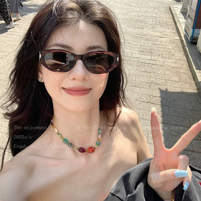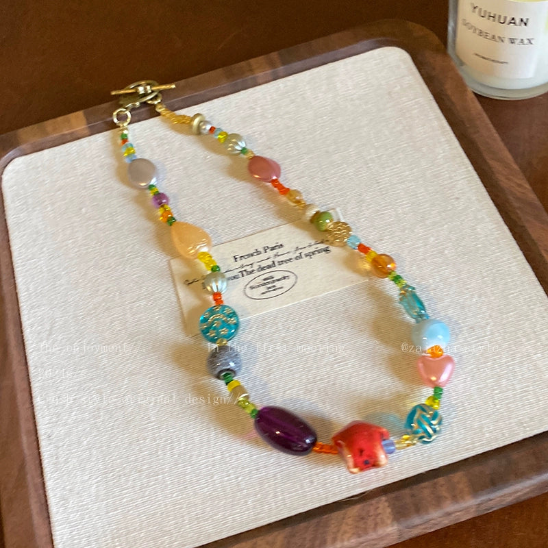 大きめカラフルなペンダントで、コーディネートのアクセントに。