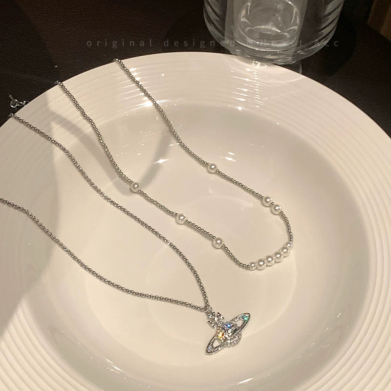 首元でキラキラ輝きを放つ。パールとの組み合わせもバッチリです。